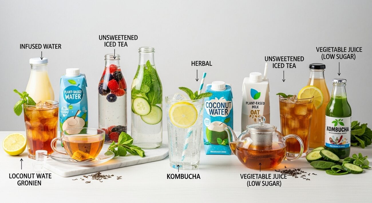 Do zdrowych alternatyw należą herbaty ziołowe, zielona herbata, kawa (bez dodatków), wody smakowe DIY, soki warzywne, koktajle, buliony, rosoły oraz niesłodzone mleka roślinne.