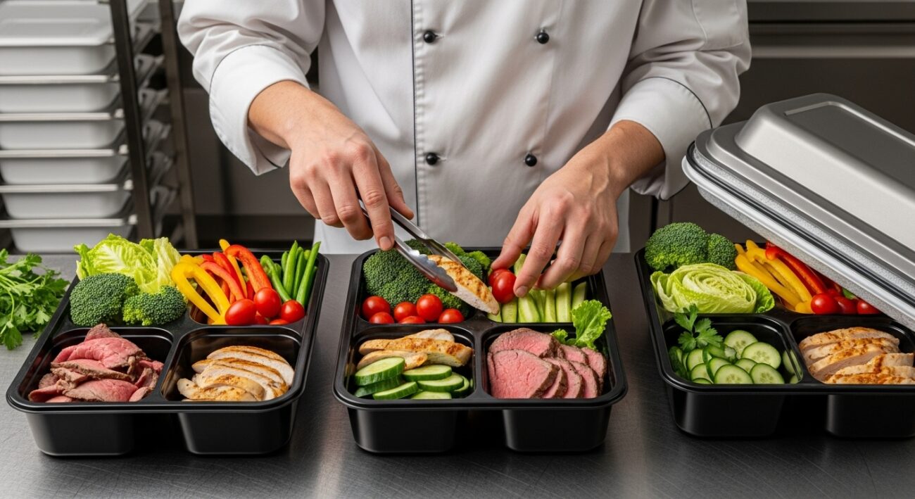 - Hermetyczne pojemniki: Posiłki pakowane są w szczelne, hermetyczne pojemniki, często z przegródkami, które izolują składniki i zapobiegają mieszaniu się smaków oraz wyciekom.