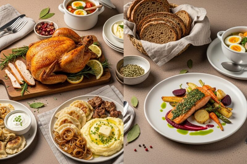 • Różnorodność to klucz: Zapewnij kilka opcji, w tym dania wegetariańskie, wegańskie i bezglutenowe. Dobrze jest, gdy na stole znajdą się zarówno dania ciepłe, jak i zimne.